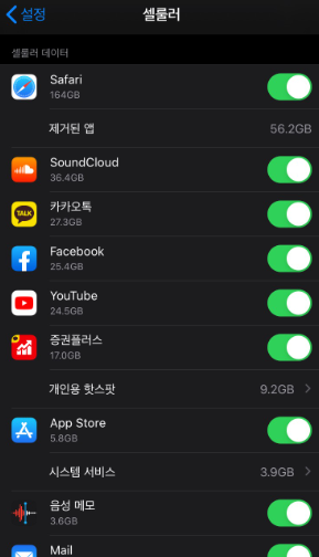 설정 > 셀룰러 데이터를 볼 수 있습니다.