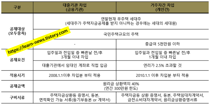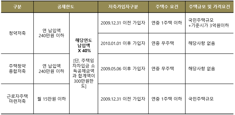 4) ‘국민주택규모’ : 주거전용면적(다가구주택은 가구당 전용면적 기준)이 1세대당 85㎡ (수도권 이외의 읍 · 면 지역 100㎡ )이하인 주택 ※ ‘주택수’ 또는 ‘국민주택규모’의 판단은 모든 주택자금공제의 경우 동일 적용됨