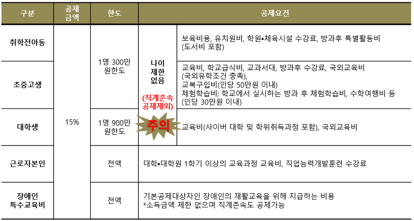 4) 기본공제대상자가 아니더라도 부양가족의 연령 제한없이 공제 가능함. (단, 직계존속의 교육비는 제외)
