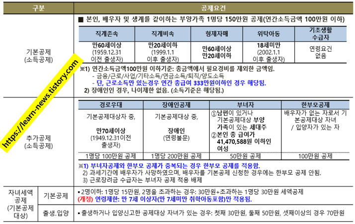 인적공제에는 아래와 같은 기준으로 연령, 소득, 생계의 요건을 갖춰야 합니다.