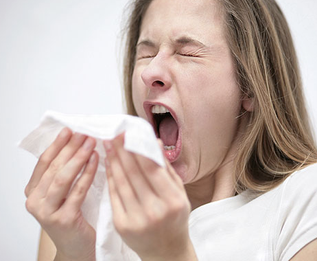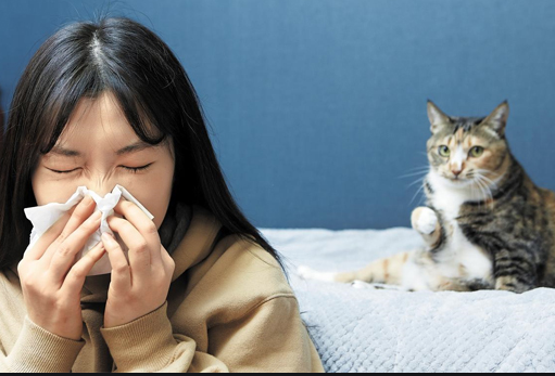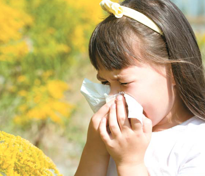 면역체계가 꽃가루, 풀, 애완동물 같은 알레르기 유발요소에 반응하면 코막힘, 눈물, 재채기, 목구멍 자극 등 증상.
