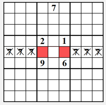 특정 행이나 열 안에 숫자를 못박는 데 도움이 될 것이다. 7번 숫자는 가운데 줄의 적색 셀에만 삽입할 수 있음을 보여주고 있다. 따라서 나머지 줄에서 숫자 7은 들어갈 수 없다.
