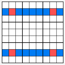 이 방법은 빨간 색으로 표시된 칸와 같이 직사각형을 구성하는 칸을 볼 때 효과가 있다. 이 예에서 빨간 칸와 파란 칸은 모두 5번을 후보 번호로 가지고 있다고 하자. 자, 만약 빨간 칸이 여러분이 5를 넣을 수 있는 2열과 8열에 있는 유일한 세포라고 상상해 보자.