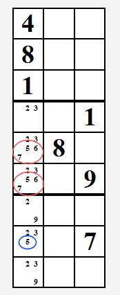 4와 7은 반드시 이 두 개의 세포 중 하나에 넣어야 하기 때문에, 파란색으로 동그라미를 친 모든 쌍은 후보로서 그 숫자를 제거할 수 있다. 이것은 1이 2열에서 단독 번호가 되고, 2가 6열에서 단독 번호가 되기 때문에 따라서 6이 4열에서 단독 번호가 된다는 것을 의미한다.