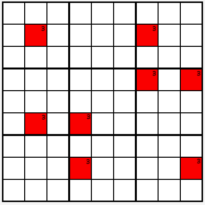 예를 들어, 숫자 3에 대해 몇몇 예상 칸에 그림이 그려졌다. 자, 2, 4, 7, 9열에서 숫자 3을 포함할 수 있는 유일한 칸은 빨간색으로 표시된 칸이라고 가정해보자.