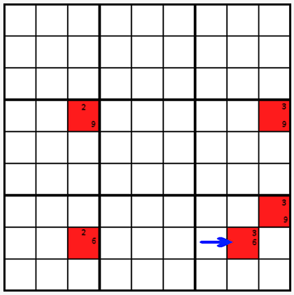 화살표가 붉은 칸을 향하도록 하여 시작하며, 그 칸에 대해 두 예상 번호 중 하나인 3 또는 6을 채운다. 그리고 나서 그 뒤를 따라 나머지 빨간색 칸을 채워 넣어보자.