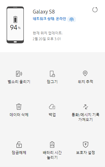 또한 위에서 설명드린 벨소리 울리기, 잠그기, 위치 추적, 데이터 삭제, 백업, 통화/메시지 기록 가져오기, 잠금해제, 배터리 시간 늘리기, 보호자 설정 기능을 사용하실 수 있습니다.