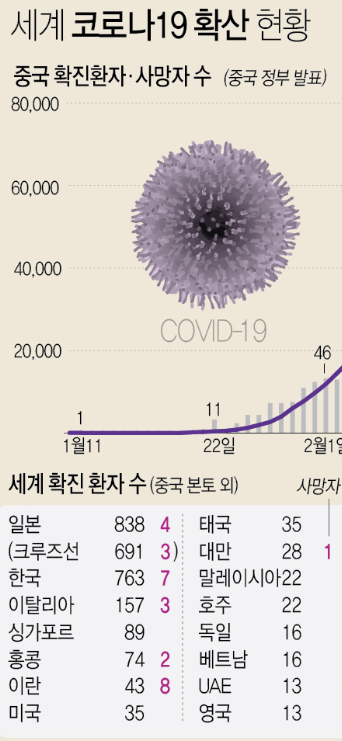 코로나바이러스 감염의 대다수는 중국 본토(7만8800여 건)에 집중돼 있으며, 그 뒤를 일본(738여 건)과 한국(602건)이 따르고 있다.