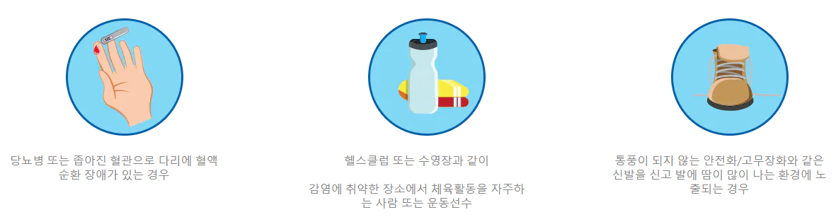 젖은 양말이나 몸에 꼭 맞는 신발을 자주 신거나, 라커룸, 사우나, 수영장, 공동 목욕탕, 샤워장 등 감염이 확산될 수 있는 공공장소에서는 주의가 필요해요.