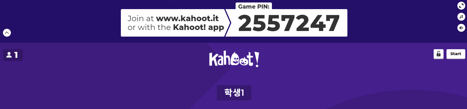 그럼 교사분 페이지에는 학생1이 접속했다고 뜨고, 옆에 Start를 누르면 퀴즈 게임이 시작되는 거예요!
