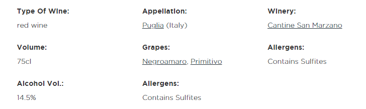 이 최고급 레드와인을 생산하기 위해, 포도는 살짝 익었을 때 손으로 따집니다. 그 혼합물은 프리미티보와 네그라마로와 같은 그 지역의 전형적인 적포도 품종을 포함합니다.