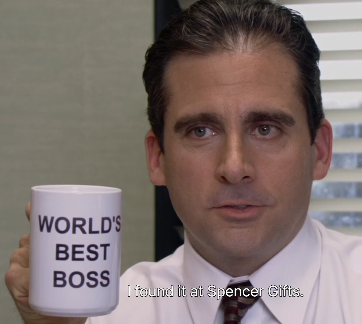 Michael: People say I am the best boss. They go, "God, we've never worked in a place like this before. You're hilarious. And you get the best out of us". I think that pretty much sums it up. I found it at Spencer Gifts.