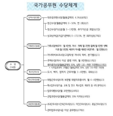 2020년 공무원 수당은 상여수당, 가계보전수당, 특수지근무수당, 초과근무수당으로 세부적으로 나누면 총 14종의 수당이 있으며, 실비변상 등의 명목으로 월 13만원의 정액급식비나 직급별 보조비 최소 11.5만원에서 최대 75만원까지 지원됩니다.