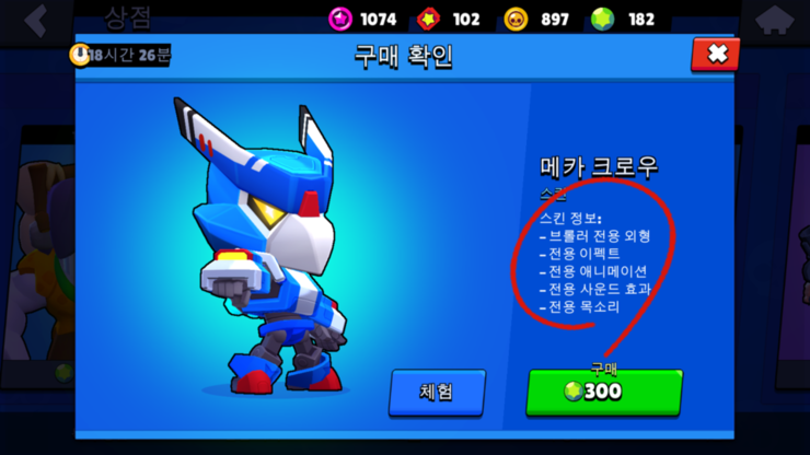 그러나 메카크로우 같은 경우는 스킨 정보가 많지만 300보석이라는 말도 안되는 금액에 판매되고 있어서 가성비가... 썩 좋아보이지 않습니다.